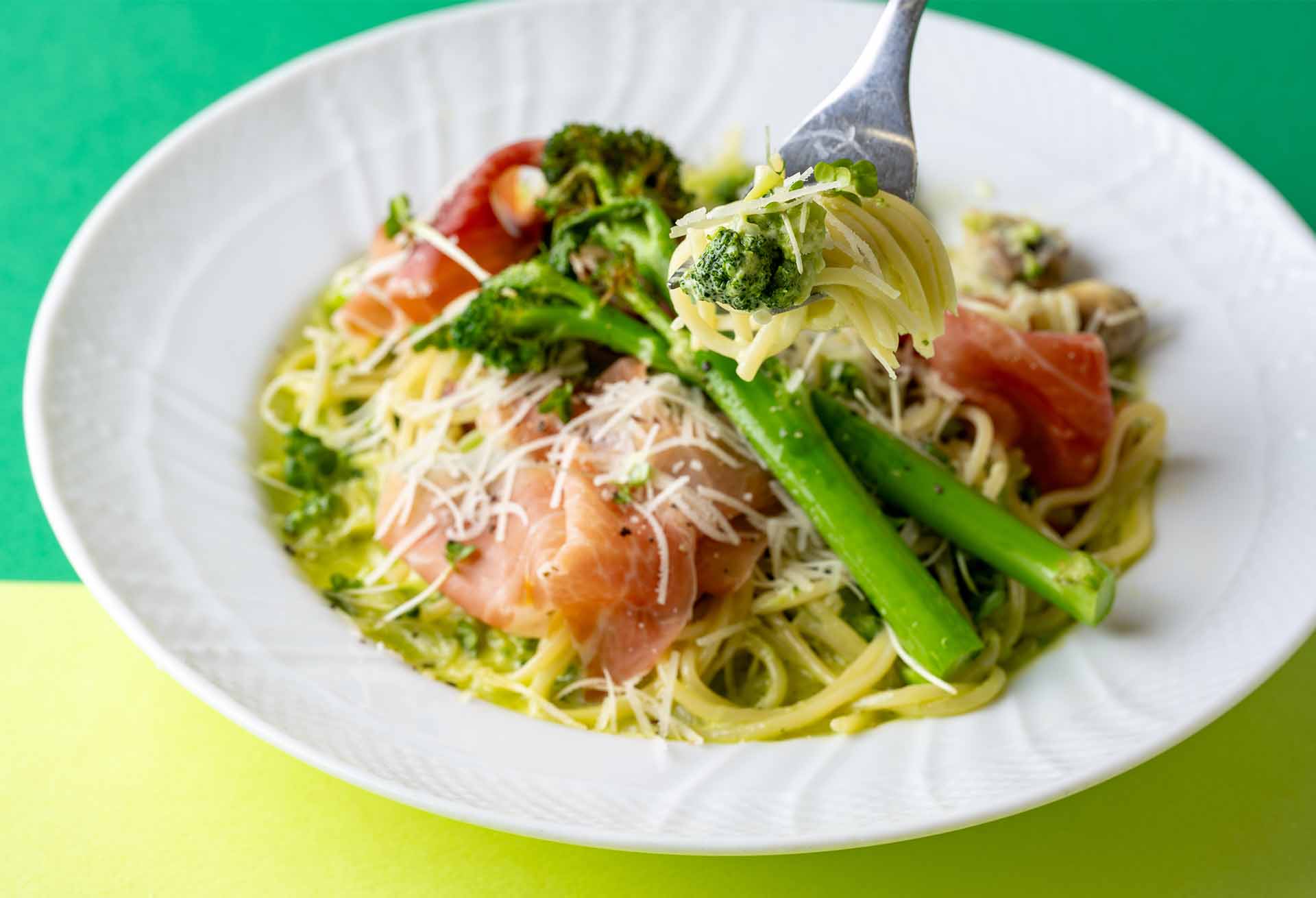 【洋食&スイーツ 不二家レストラン】ブロッコリー尽くしの緑彩りクリームスパゲティ