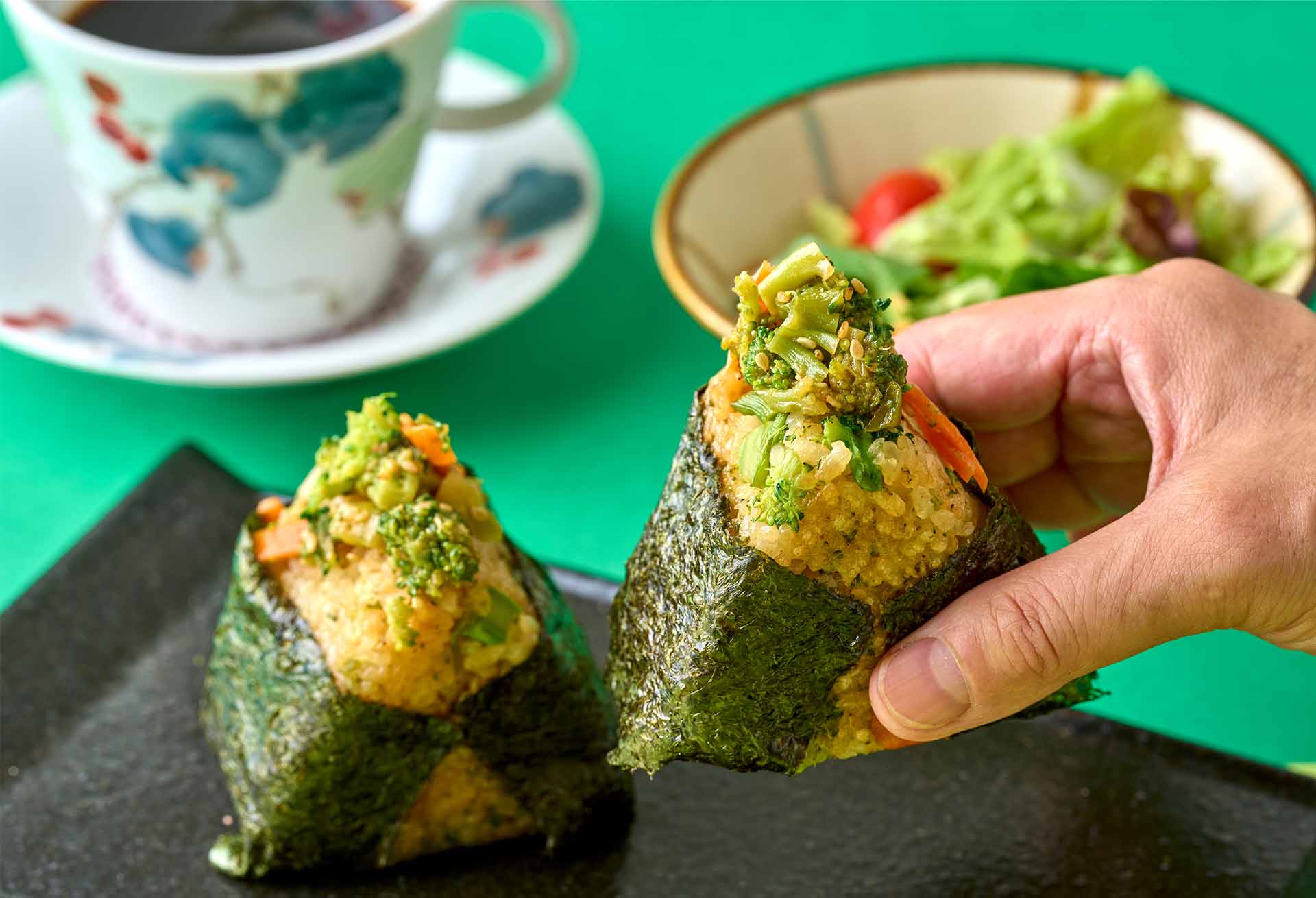 【純喫茶・スイーツ・軽食 但馬屋珈琲店】ブロッコリーのきんぴらの焼きおにぎり(2個/サラダ付)