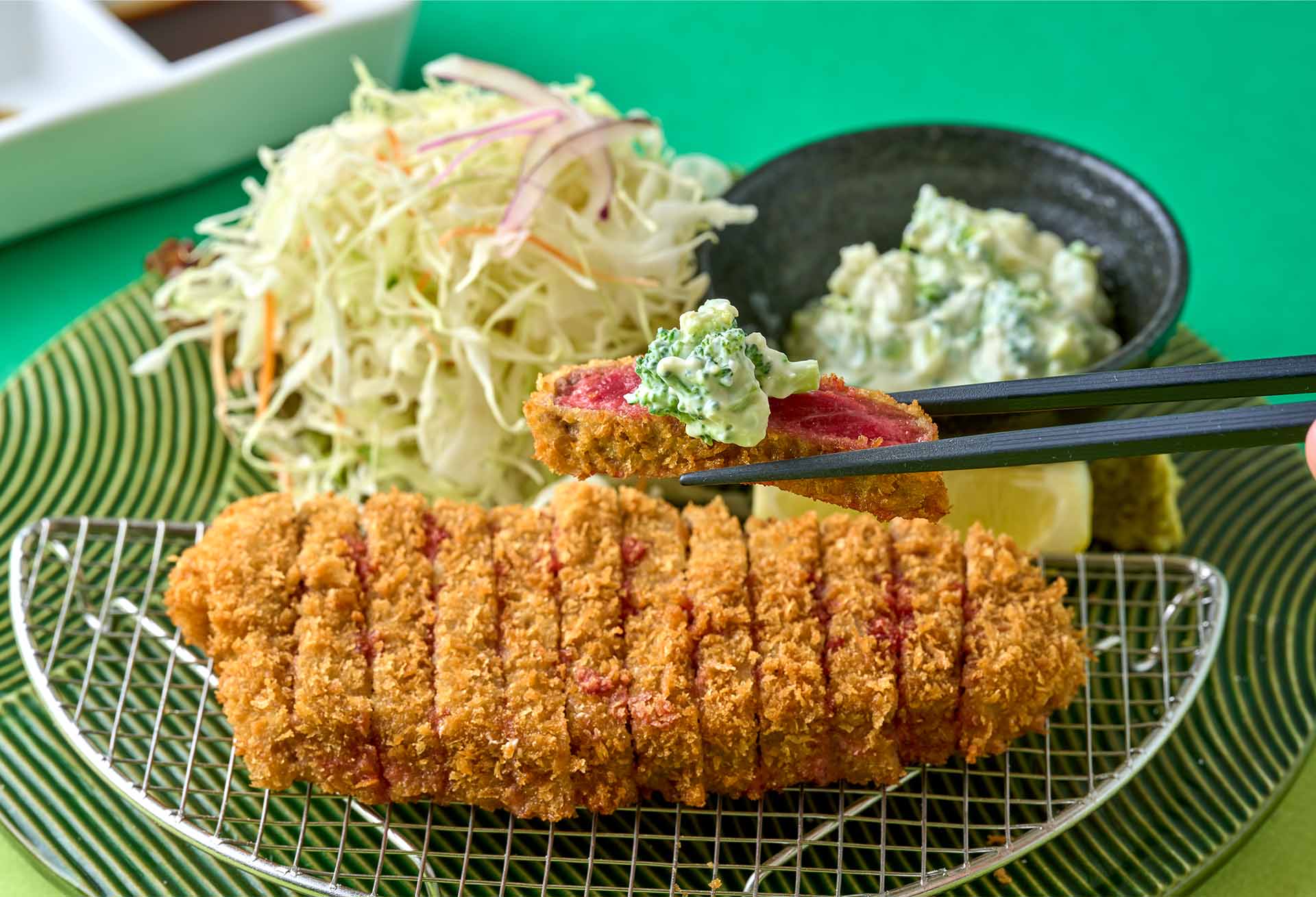 ブロッコリーをたっぷり使った特製ソース。シャキッとした食感に、クリームチーズのまろやかさ、ヨーグルトとレモンの爽やかな酸味が重なり、後味は意外なほど軽やかだ。仕上げのわさびがピリッと効いて、牛カツの旨みをきれいに引き立ててくれる。緑と白のコントラストも美しく、見た目にも食欲をそそる。