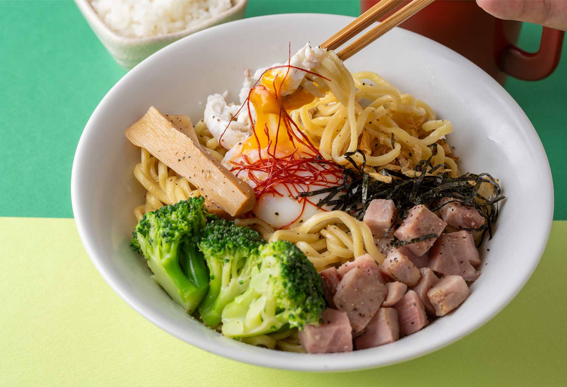 まずブロッコリーと長芋の具沢山バター醤油。長芋のシャリシャリ感、ホタテとしめじのむにゅっとした食感、そこにブロッコリーのゴロゴロした存在感が加わることで、これまで体験したことのない食感のレイヤーが生まれる。バターのコクはあるのに重すぎず、口の中が忙しいのに不思議とまとまっている。もちろん、うまい。