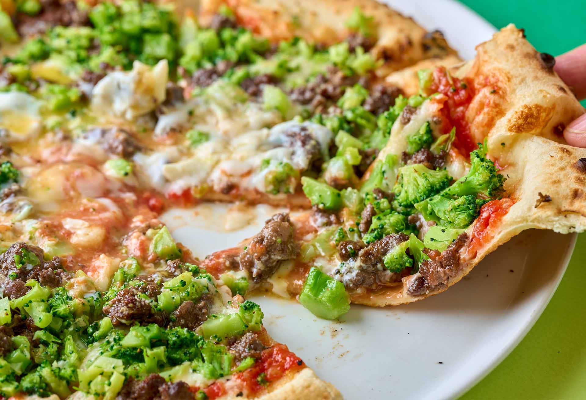 ジューシーで食べ応えのある北海道産牛挽肉に、ビタミンCと食物繊維が摂れるブロッコリーを合わせ、隠し味にはちみつをほんのり。ブロッコリーを細かく刻む工夫で、野菜が苦手な人でも抵抗なく食べられる設計になっている。彩りも豊かで、見た目から気分が上がるピッツァだ。