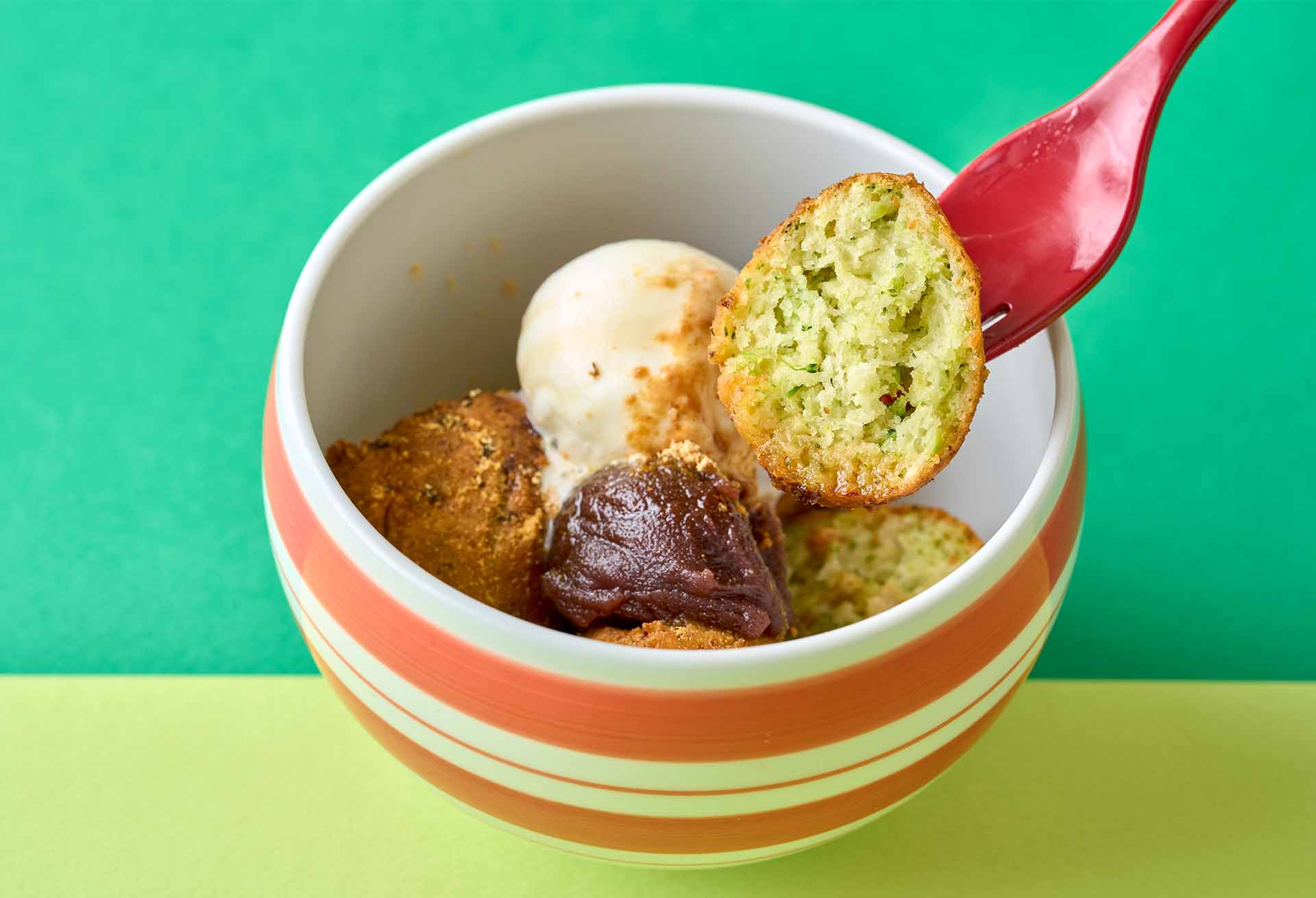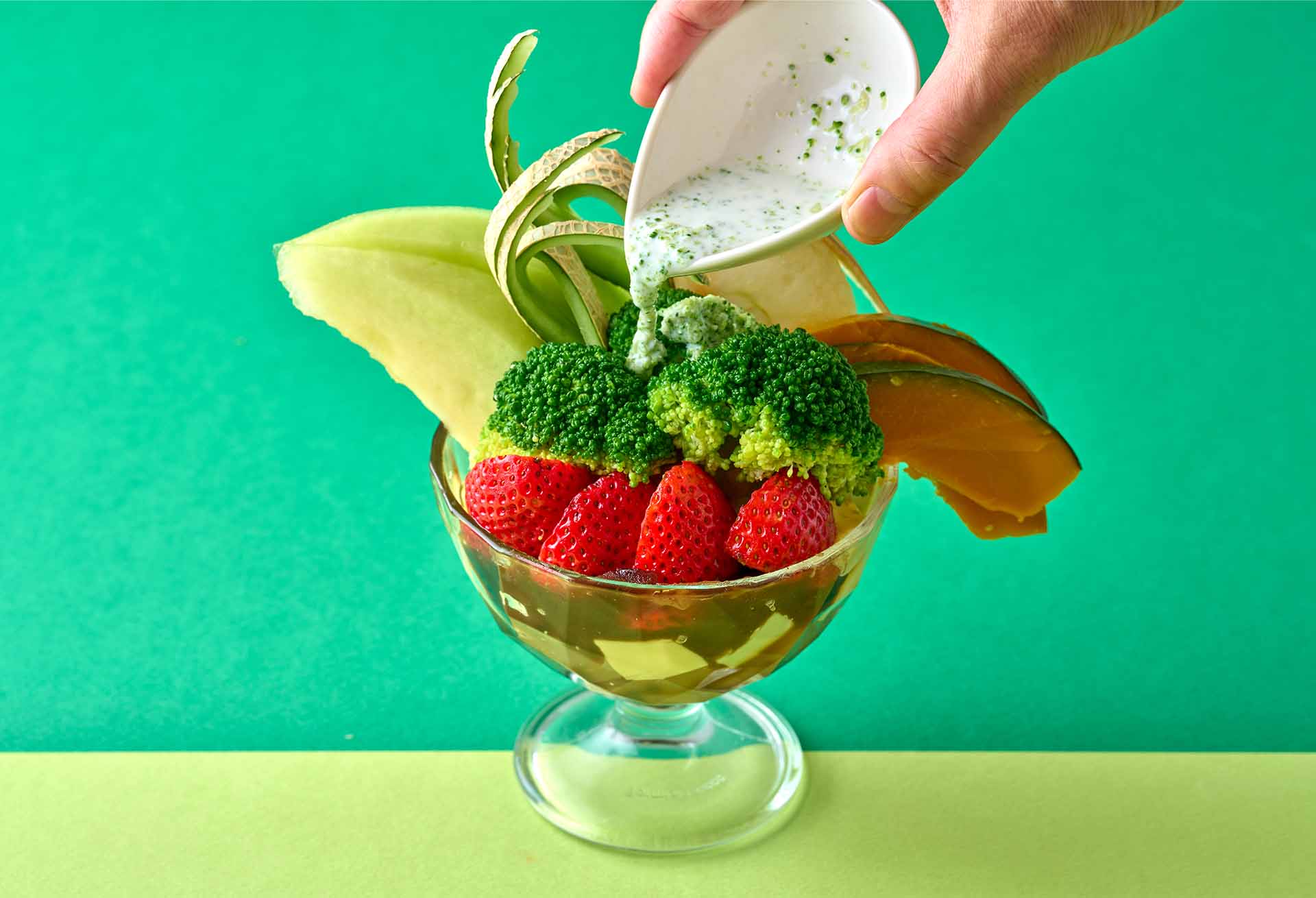 あんみつにフルーツだけでなく、野菜を組み合わせた全く新しい発想のスイーツ。緑と黄のムースは、野菜の自然な甘味を活かしたやさしい味わいで、果物の酸味や蜜の甘さと見事に調和している。