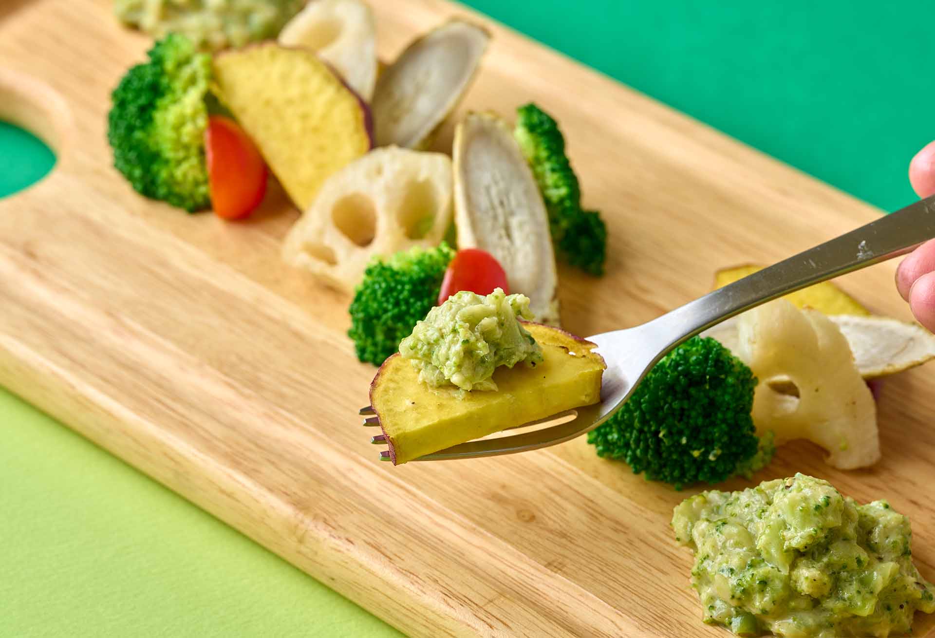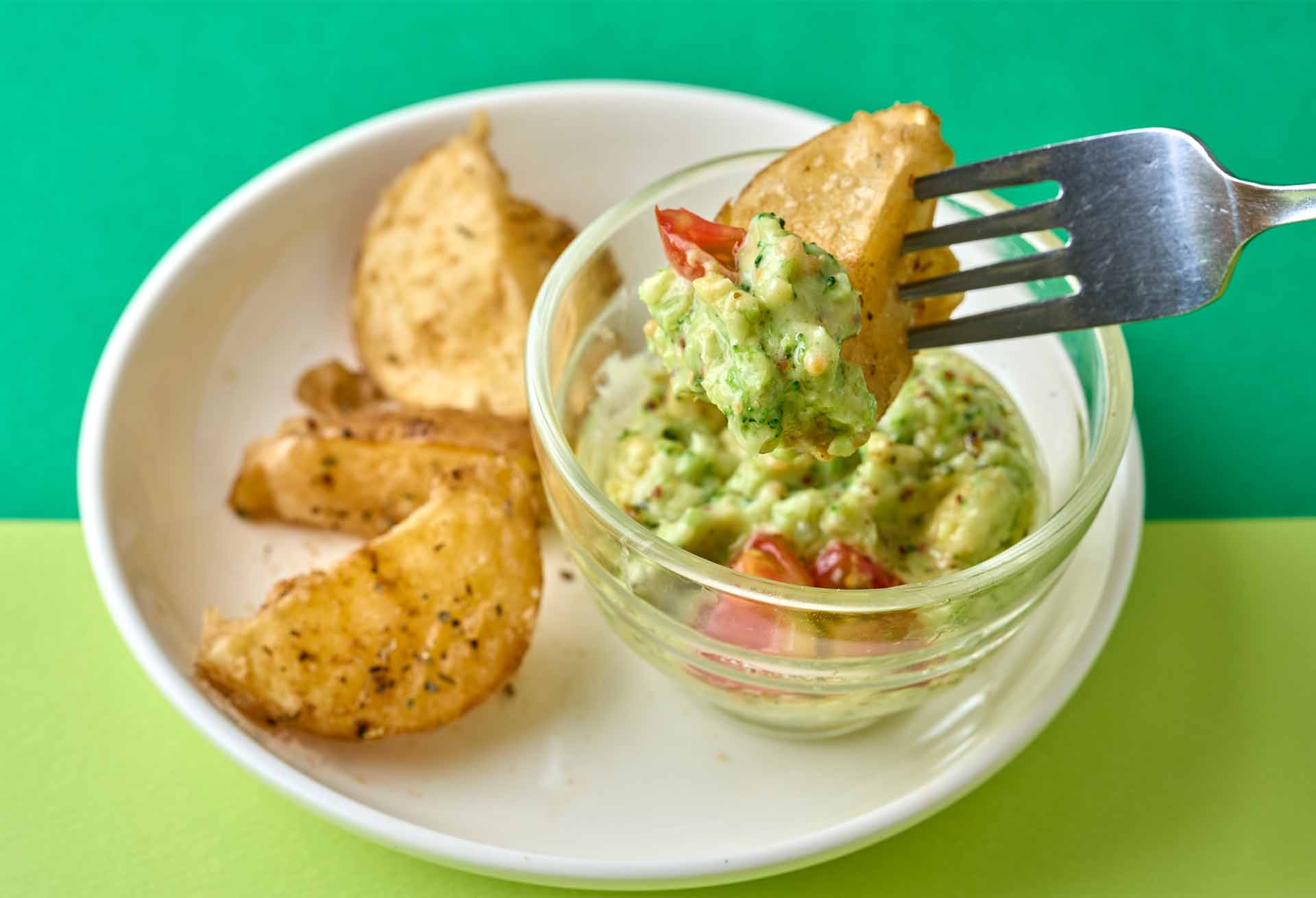 メキシコ料理のワカモレをヒントに、アボカドのまろやかさにブロッコリーを合わせた新感覚ソース。ブロッコリーのツブツブとした食感がアクセントになり、なめらかなアボカドと合わさることで、つい手が止まらなくなる。合わせるポテトは、ホクホクで甘みの強い北海道産「インカのめざめ」。素材の相性は文句なしだ。