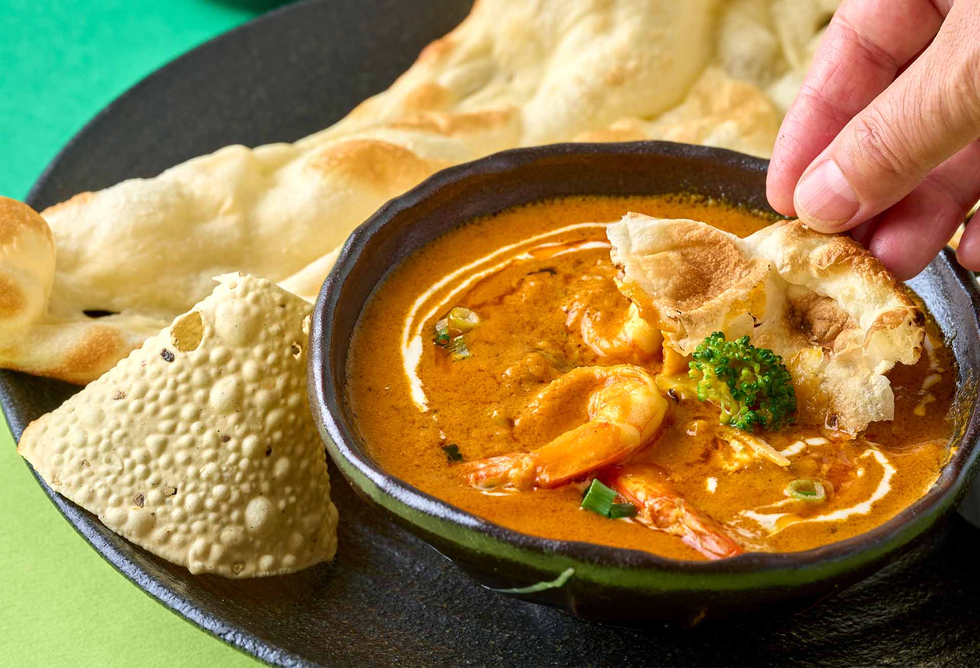ぷりっとしたエビと、ゴロゴロと存在感のあるブロッコリーを組み合わせた、彩り豊かなスパイスカレー。複数のスパイスを丁寧に配合し、香りと風味を立たせつつ、仕上げに少量のレモン汁を加えることで、後味は驚くほど軽やか。スパイスの厚みはありながら、最後まで飽きずに食べ進められる設計になっている。