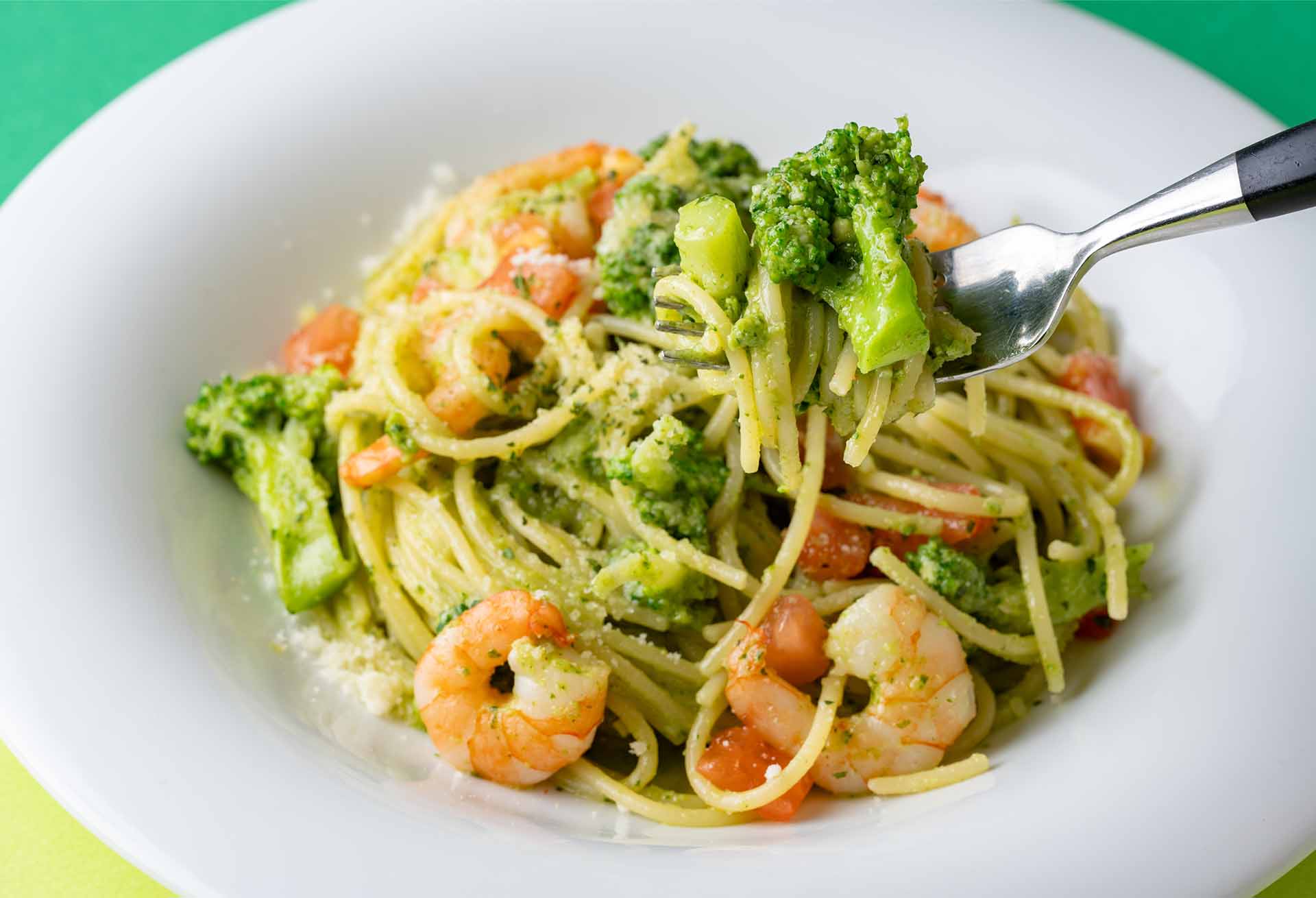 バジルが主役のジェノベーゼソースに、さらにブロッコリーを混ぜ込むという、緑×緑で深緑。ブロッコリー由来のやさしい甘みが加わることで、ジェノベーゼ特有の尖りがやわらぎ、全体としてとてもまろやかな味わいに仕上がっている。栄養面でも、1日分のビタミンCに加え、成人女性の1日必要量の約2/3の食物繊維を含むという、なかなか頼もしい内容だ。