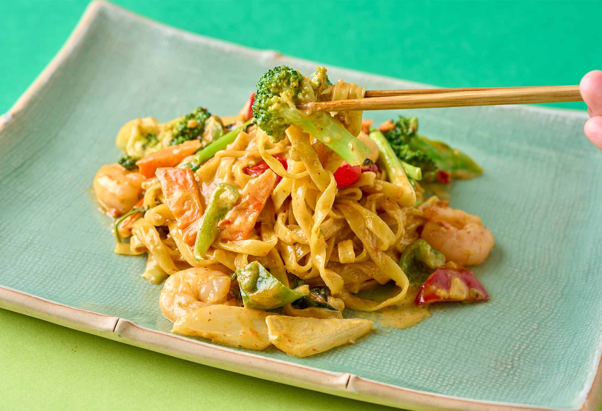 ゴロゴロと入ったブロッコリーが主役の、見た目にも鮮やかな炒め麺。ぷりぷりの海老、カラフルな野菜、そしてチリオイルと生クリームという意外な組み合わせが織りなす、タイと洋のハイブリッド。まさに「辛さとコクの共演」だ。