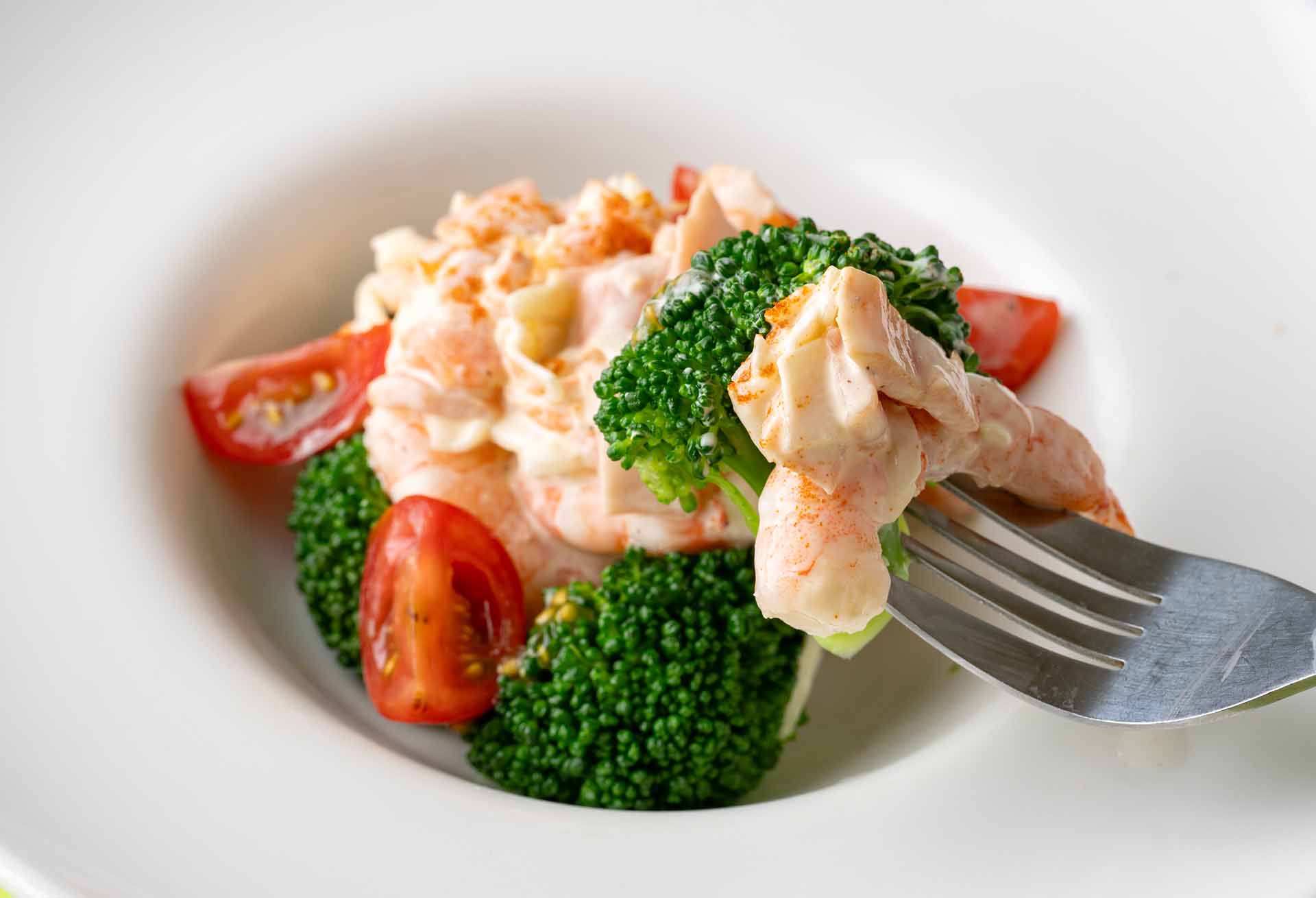 茹でたてのブロッコリーに、ぷりぷりのボイル海老、旨みの濃いスモークサーモンを贅沢に合わせた一皿。赤パプリカの彩りと玉ねぎのシャキシャキ感が加わり、特製タルタルソースで全体をまとめている。レモン汁の爽やかさと、仕上げのチリパウダーのほのかな辛みが効いていて、味の輪郭がとてもはっきりしている。