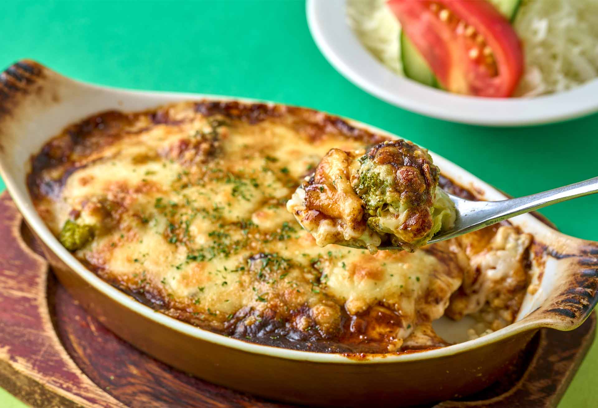 ハヤシソースとホワイトソース、2種類の味わいが重なり合う贅沢なドリア。ブロッコリーをはじめ、秋が旬の食材がたっぷり使われており、肉と野菜の旨みがぎゅっと詰まった手作りハヤシソースが、まろやかなホワイトソースと見事に調和している。